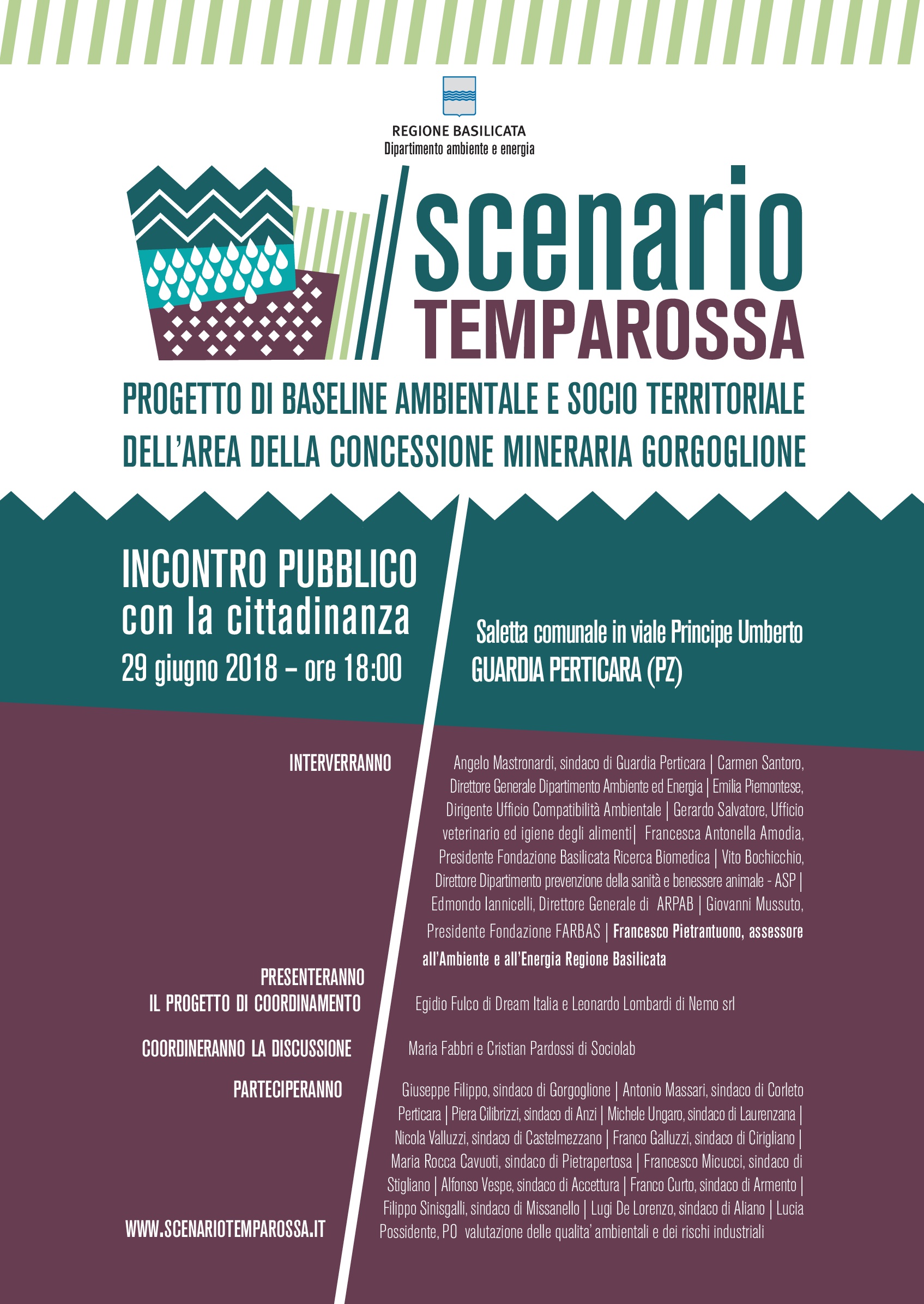L’incontro – pubblico e aperto a tutta la cittadinanza – è previsto per Venerdì 29 Giugno a partire dalle ore 18.00 presso la Saletta comunale in viale Principe Umberto, nel Comune di Guardia Perticara (Pz). L’obiettivo della serata sarà quello di presentare finalità, obiettivi e fasi del progetto, raccogliendo dal confronto con le comunità locali le principali preoccupazioni, gli elementi di criticità, ma anche le opportunità e le proposte sulla base delle quali costruire una politica condivisa di monitoraggio delle attività del centro oli che veda protagoniste le istituzioni regionali e locali, ma anche le comunità territoriali, i cittadini e quanti sono mobilitati su questi temi.